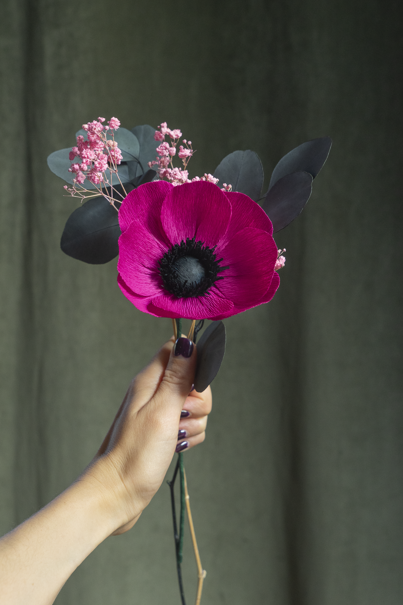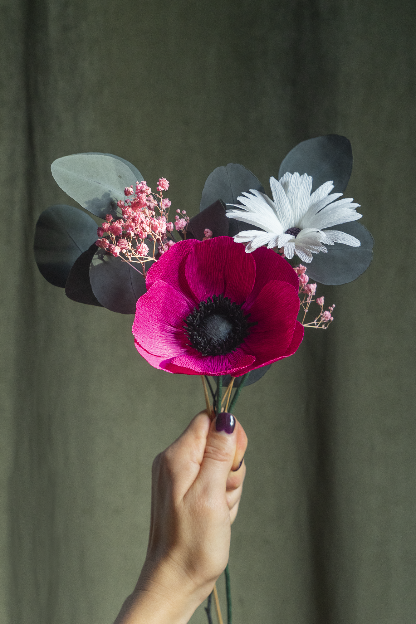 La Collection de Bouquets Rouge Fushia viendra égayé votre intérieur ou celui de l'heureux élu ! Pavots, Cosmos, Tulipes...toutes ces fleurs en papier sont accompagnées de gypsophile séché et d'eucalyptus stabilisé. Ils offrent un bouquet trompe l'oeil, d'une durée éternelle !