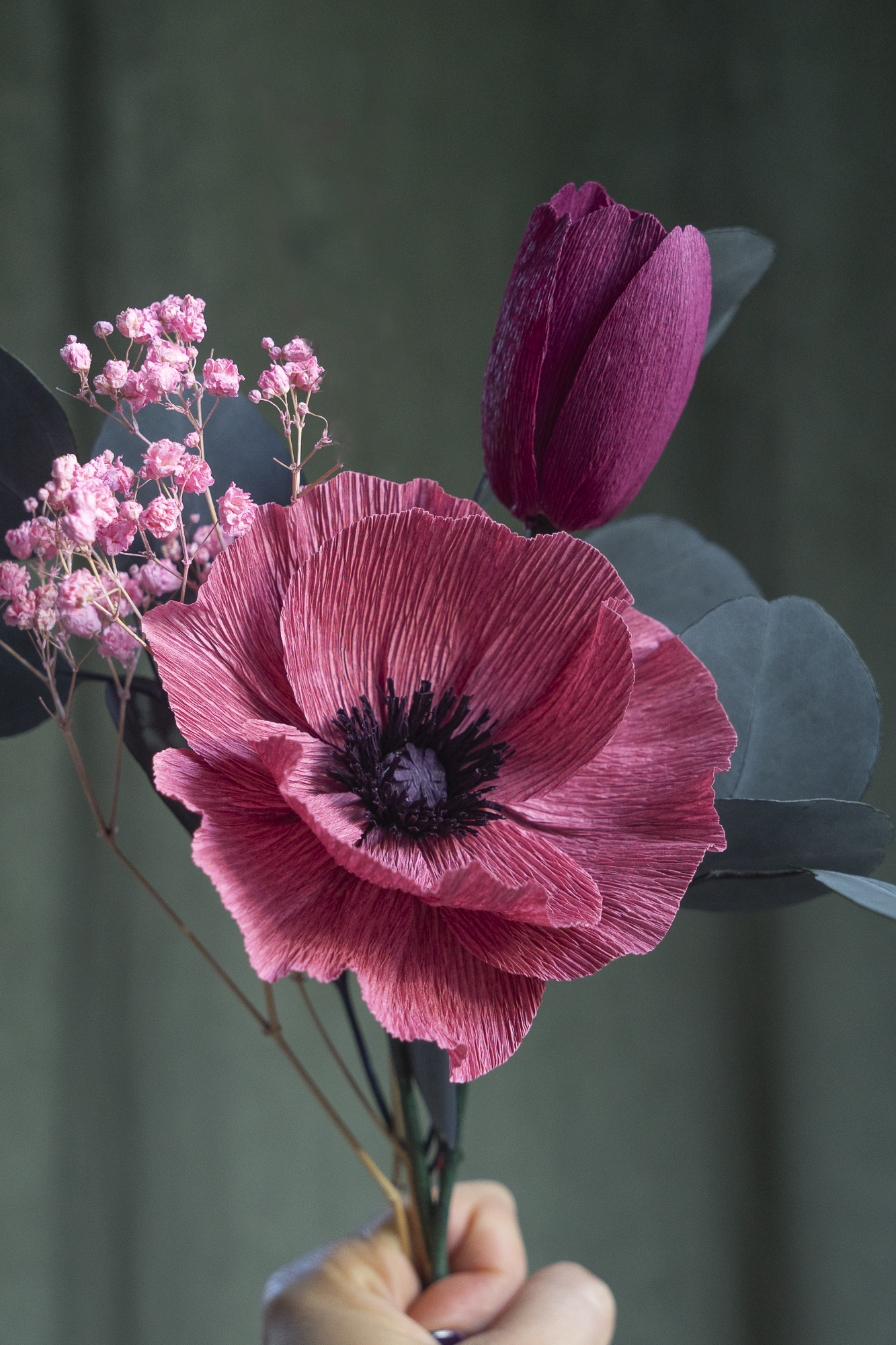 La Collection de Bouquets Vieux Rose viendra égayé votre intérieur ou celui de l'heureux élu ! Pavots, Cosmos, Tulipes...toutes ces fleurs en papier sont accompagnées de gypsophile séché et d'eucalyptus stabilisé. Ils offrent un bouquet trompe l'oeil, d'une durée éternelle !